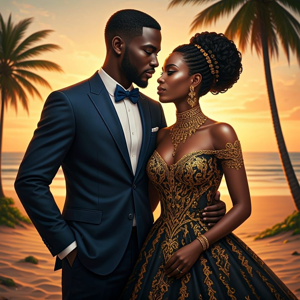 Picture a black Ghanaian man, dressed in a stylish black suit and navy-blue bow tie, sharing a tender moment with his beautiful Jamaican bride, who is adorned in a stunning black and gold wedding gown. They are standing on a lush, tropical beach, surrounded by their closest family and friends. The sun sets behind them, casting a warm, golden glow on the scene. Hyperrealistic, splash art, concept art with intricate details, deep color, and dramatic lighting, reminiscent of a high-fashion editorial spread.