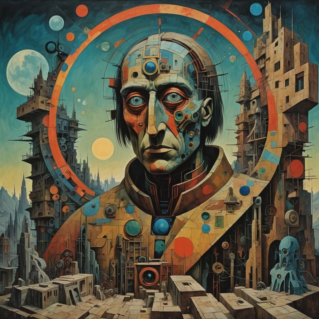 A striking image of a godlike figure in a dystopian sci-fi setting. The artwork blends art deco elements with hyperrealistic rendering, creating a surreal and captivating scene.