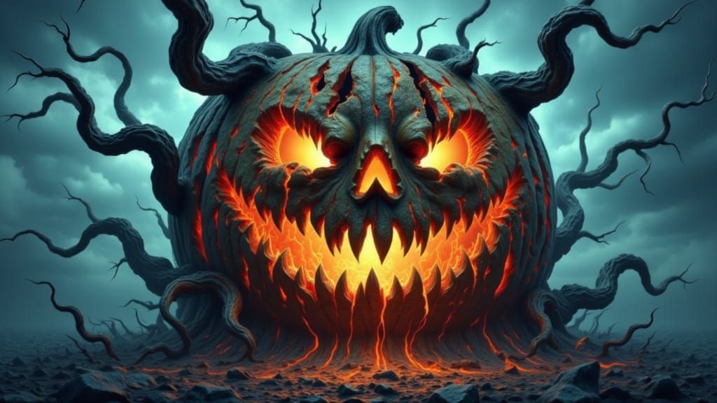 This image showcases a hyperrealistic, incredibly detailed Jack o'Lantern with vibrant colors and lava cracks. Rendered with cinematic depth, it features extreme detail and color depth.