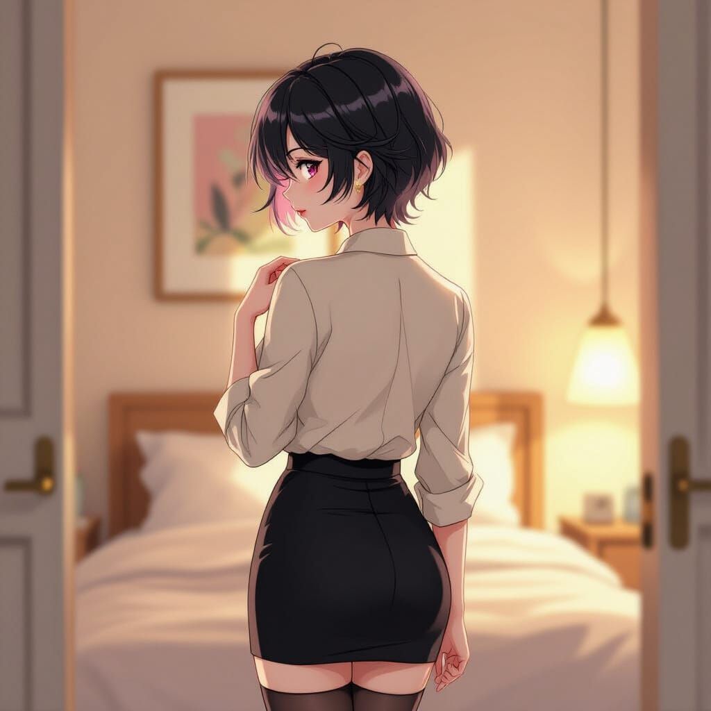 This image shows a slender anime-style boy in a warmly lit bedroom. Rendered in vibrant colors with soft shading, the character's feminine features are emphasized by elegant clothing and delicate styling.