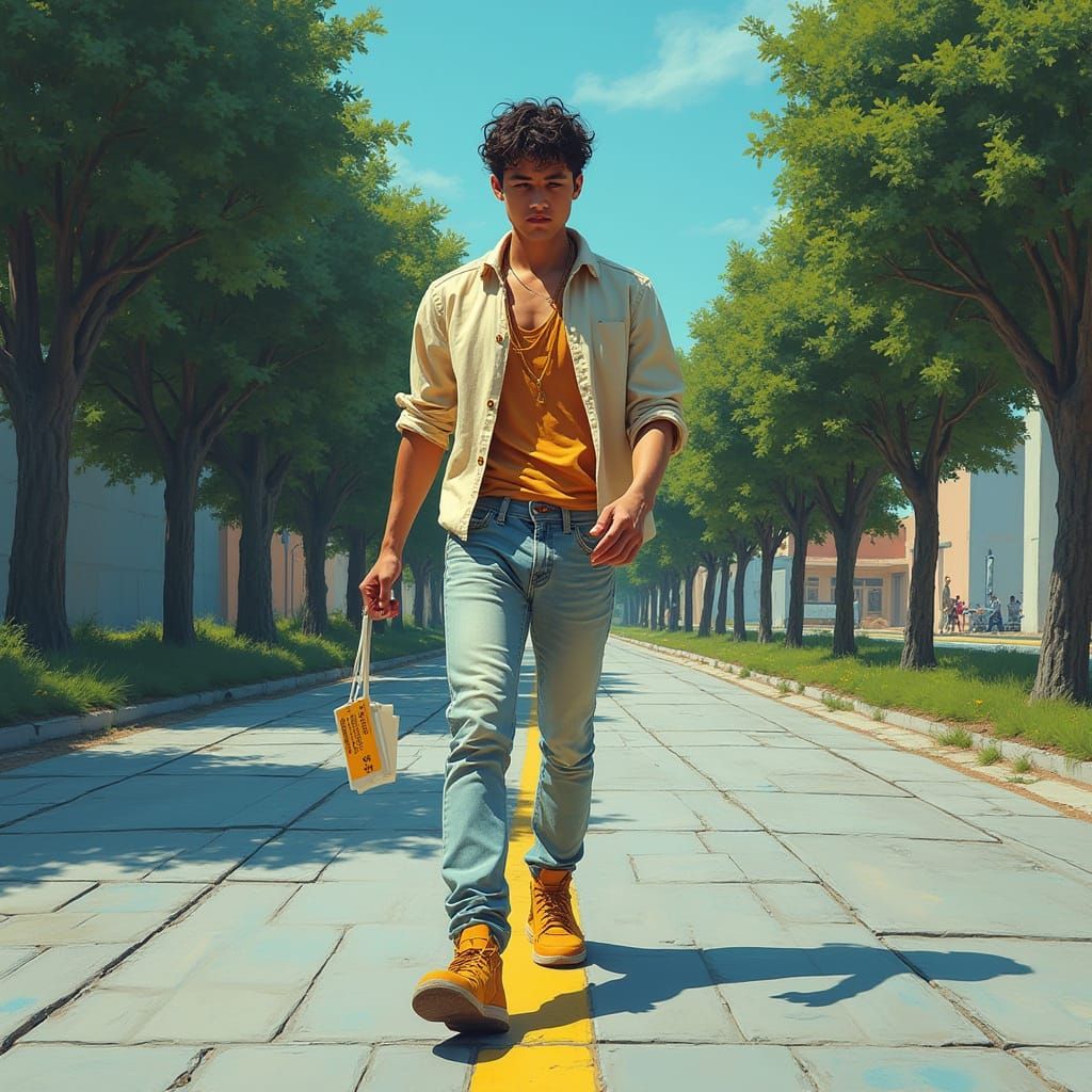 This image shows a young man in casual clothes walking to the cinema, unaware that a thief is stealing his necklace. The scene is depicted with futuristic neon accents and vibrant brushstrokes.