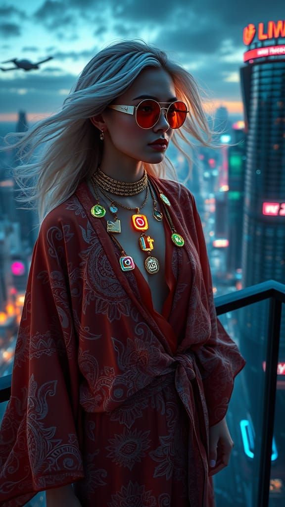 A striking picture of a woman with windswept white hair and smart sunglasses, wearing a flowing kimono and holographic jewelry. She's on a balcony overlooking a neon-lit megacity in a cyberpunk aesthetic.