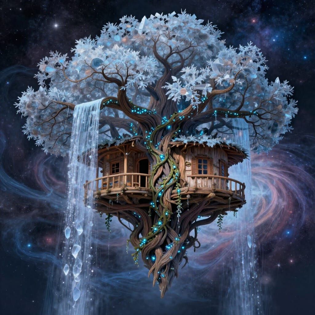 This image depicts a massive, ancient treehouse made of glowing vines and petrified wood, suspended in a colorful nebula. Crystalline waterfalls flow into the void, creating a dreamlike, ethereal scene with painterly and holographic qualities.