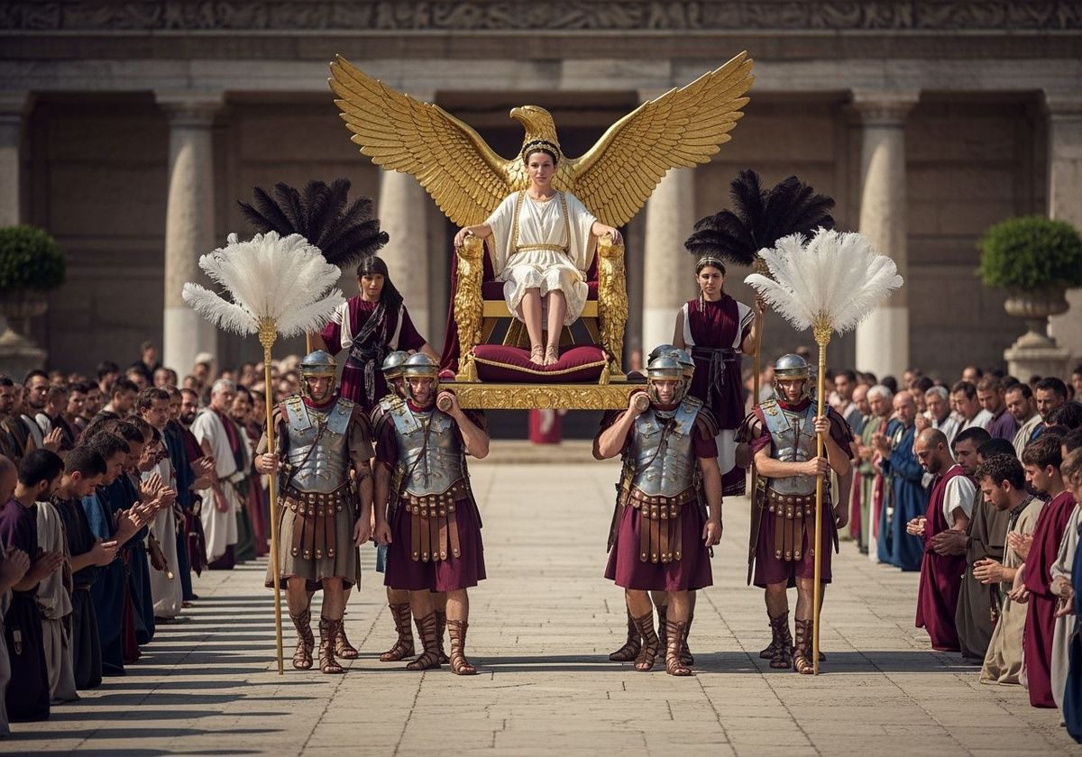 This image shows a Roman Empress being carried on a golden eagle throne by soldiers, attended by servants with feather fans. Kneeling peasants pay homage in this professionally photographed scene with natural lighting.