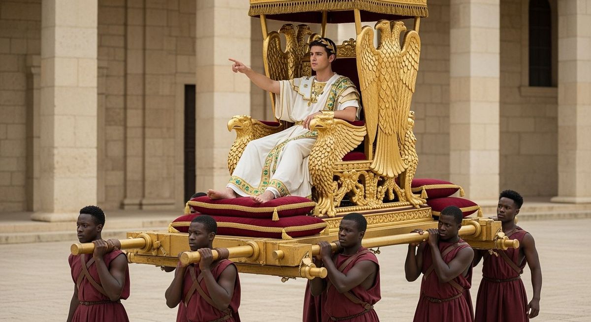 This image shows a young Roman emperor sitting barefoot on a gold throne carried by servants. He wears a lavish toga and points in the direction of travel. The photograph is professionally lit with a sharp focus.