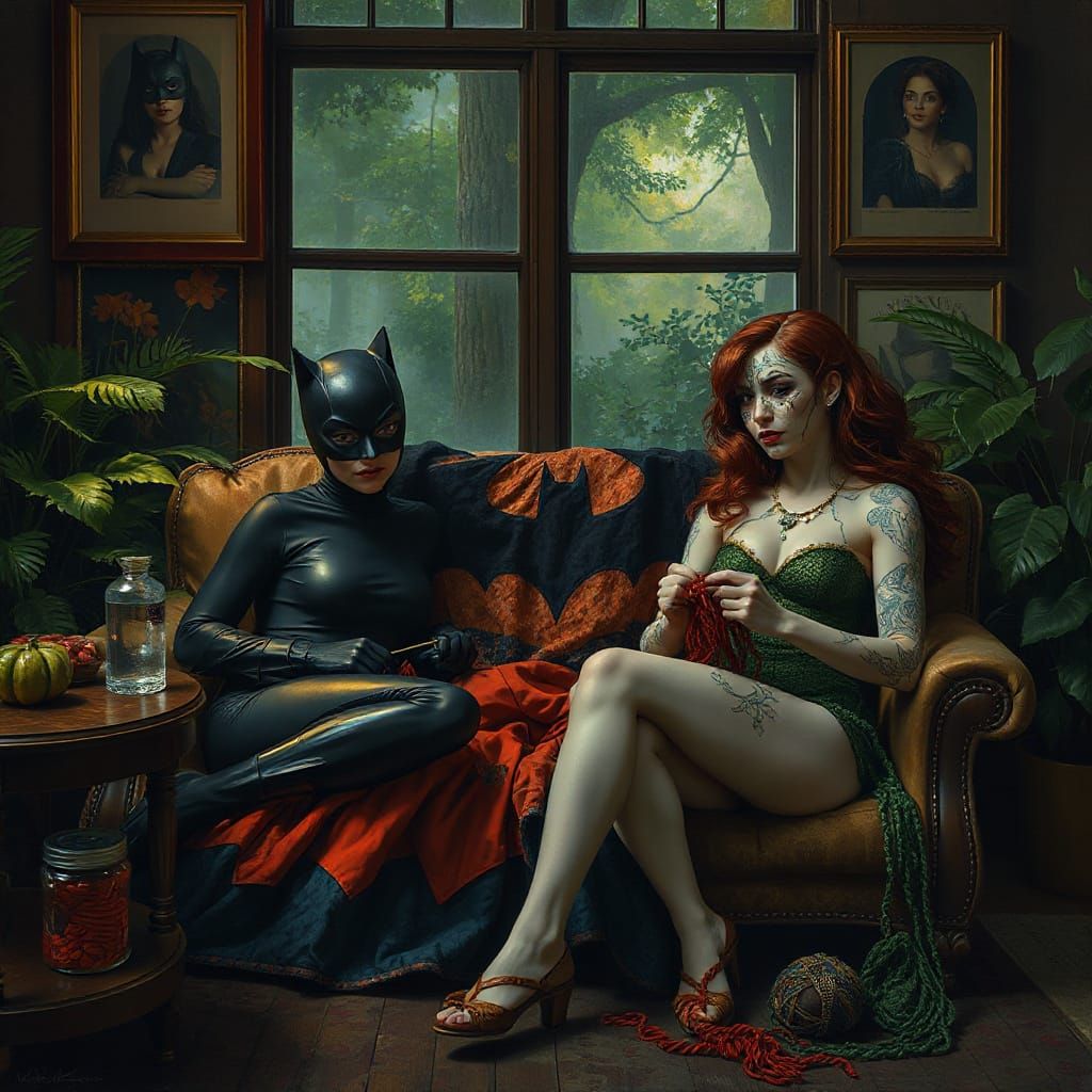 A serene scene of Catwoman and Poison Ivy quilting together in a lush, dimly lit parlor, blending elegant Art Nouveau and whimsical illustration styles.