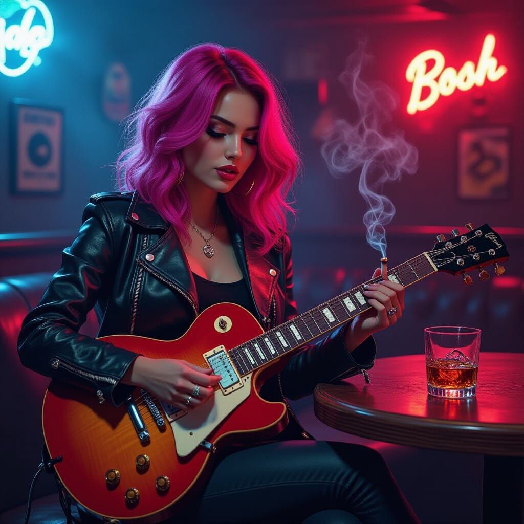 This image shows a focused young woman with pink hair playing an electric guitar in a dimly lit bar, holding whiskey and a cigarette. Features dramatic lighting and a digital painting style.