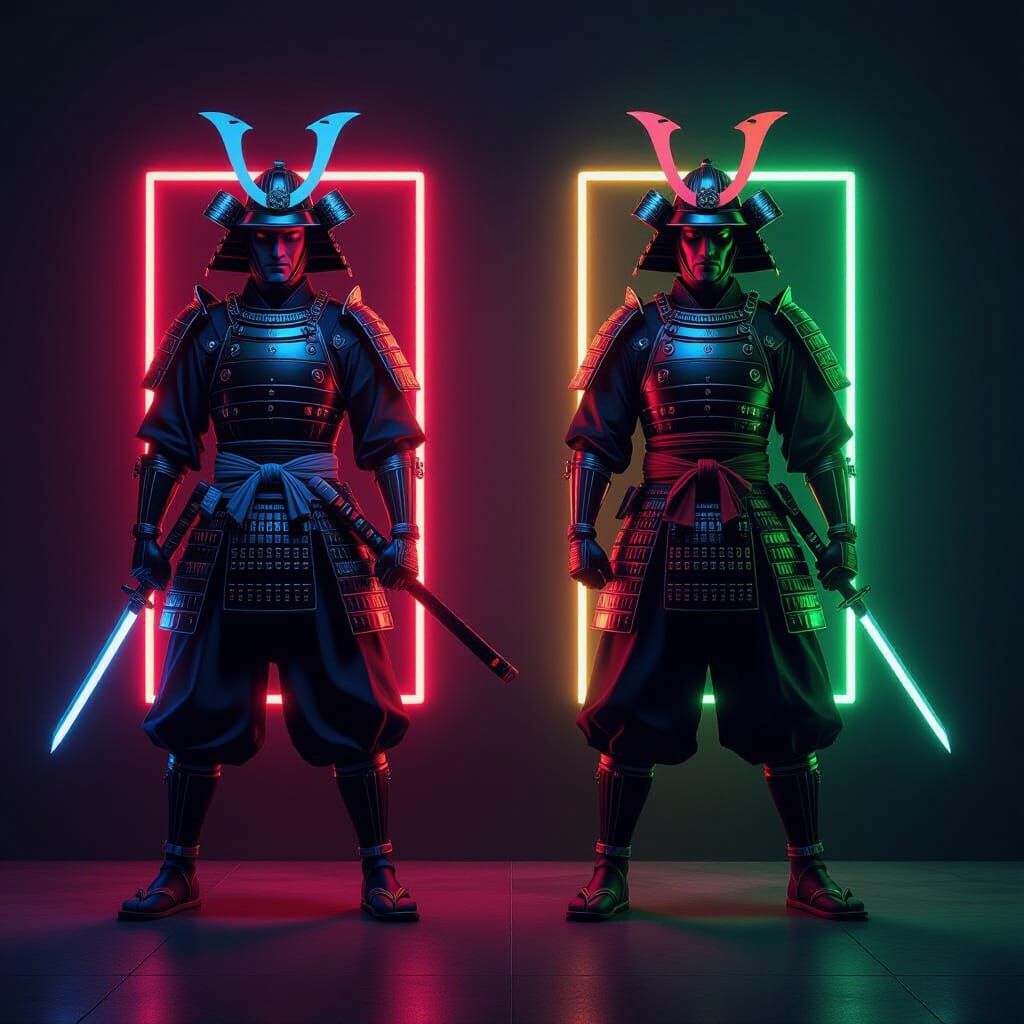 This image shows two stylized samurai figures illuminated by neon lights against a dark backdrop. The artwork blends pop art and digital art styles, incorporating geometric Bauhaus elements.