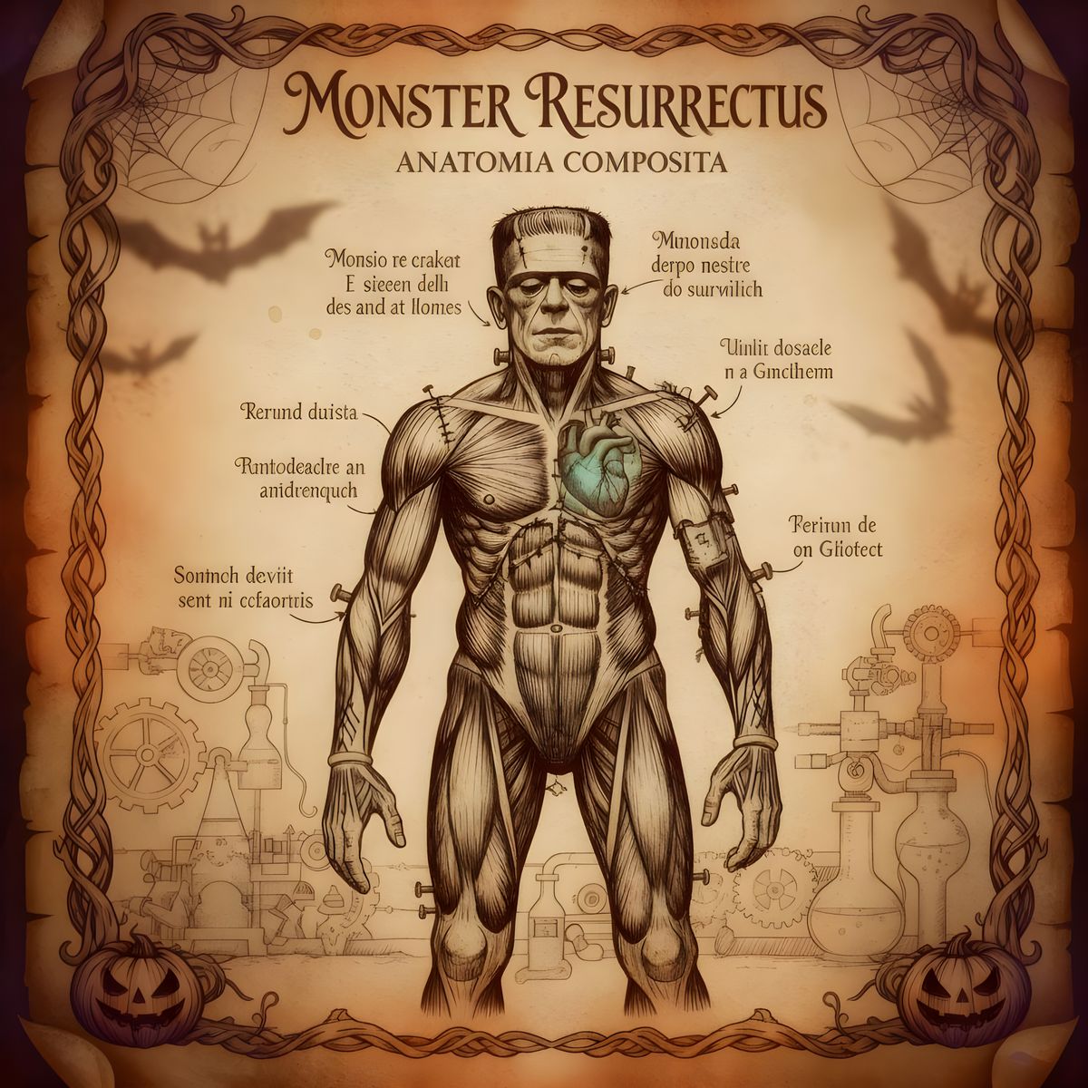 This image is an anatomical chart drawing of a Frankenstein Monster in the style of Leonardo da Vinci. It features intricate linework, cross-hatching, sepia tones, and a subtle spooky Halloween ambiance.