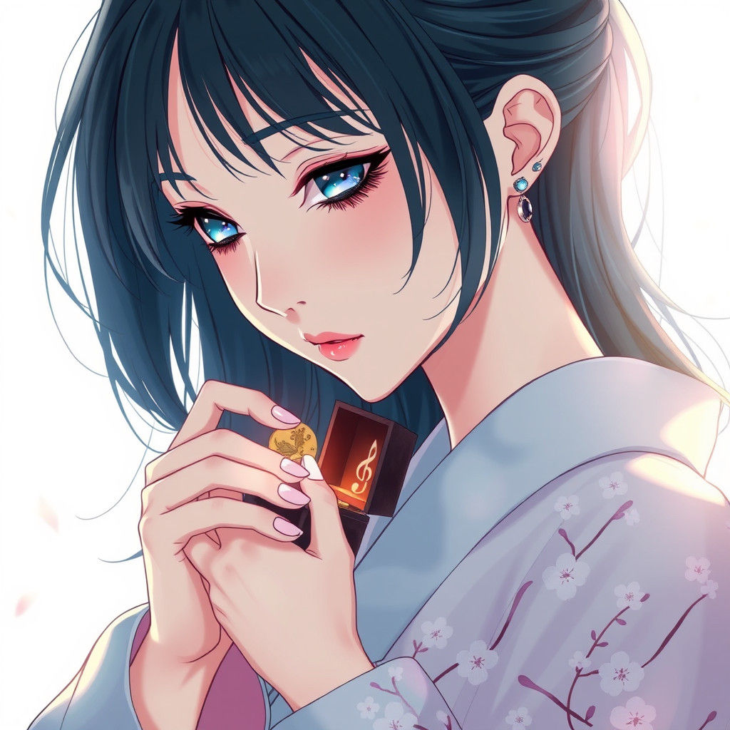 A captivating anime-style image of a thoughtful raven-haired woman holding a music box. Her sapphire eyes reflect deep emotion as she wears a flowing kimono adorned with cherry blossoms in a manga aesthetic.