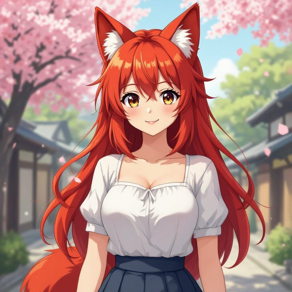 This image shows an anime-style fox-girl with red hair wearing a shirt and skirt. The character design takes inspiration from Japanese manga and animation styles with a Pixiv art influence.