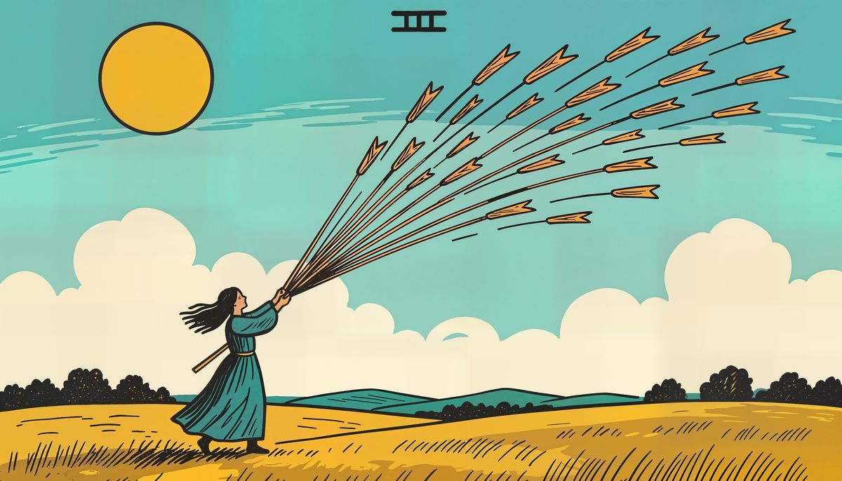 This image shows a rendition of the Eight of Wands tarot card in a vintage style. Eight wooden staves descend diagonally across the scene, rendered with a rough, hand-drawn aesthetic.