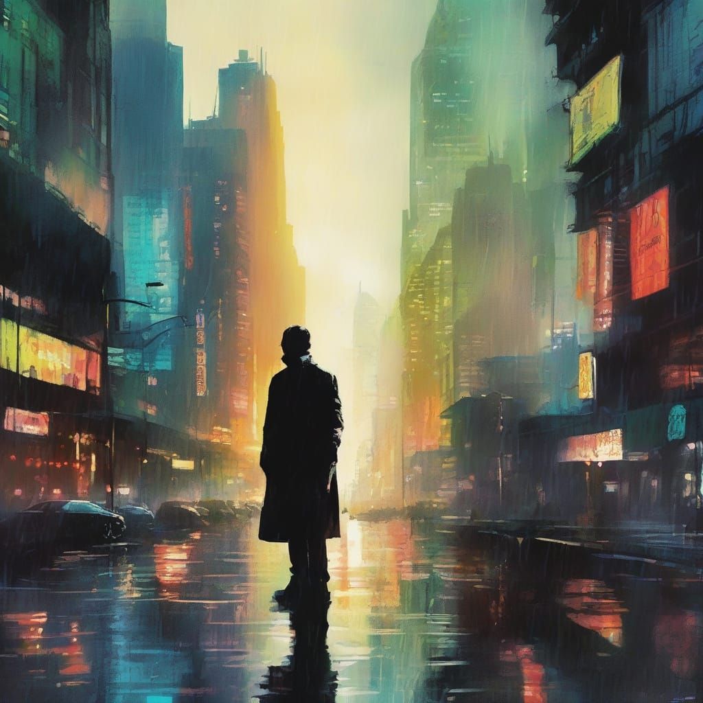 A watercolor-style reimagining of a Blade Runner movie poster. It features a detective on a rooftop overlooking a rain-soaked, futuristic city with subtle religious symbols.