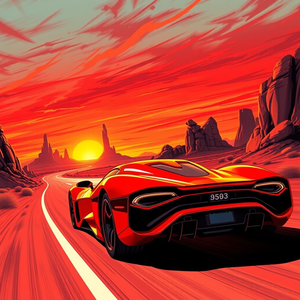 This image shows a futuristic red sports car speeding along a desert highway at sunset. The artwork is reminiscent of comic book art, featuring smooth lines and vibrant, neon colors.
