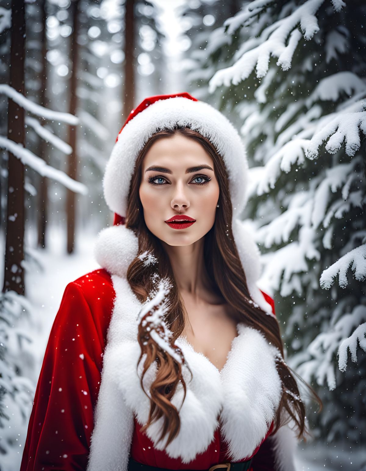 A striking picture of a beautiful young woman in a Santa Claus costume standing in a snowy forest. The surreal image captures a dreamy, ethereal atmosphere with falling snow and a magical aura.