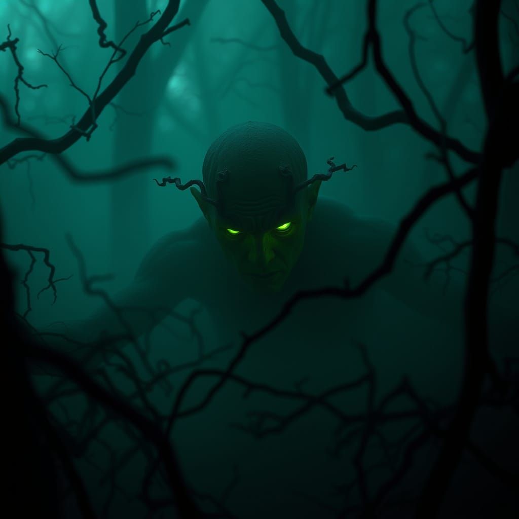 A sinister green man emerging from mist, eyes glowing neon green, twisted vines as arms, foggy forest, shadows moving eerily, cinematic horror realism, ultra-detailed textures โ โThe Green Manโ horror fantasy