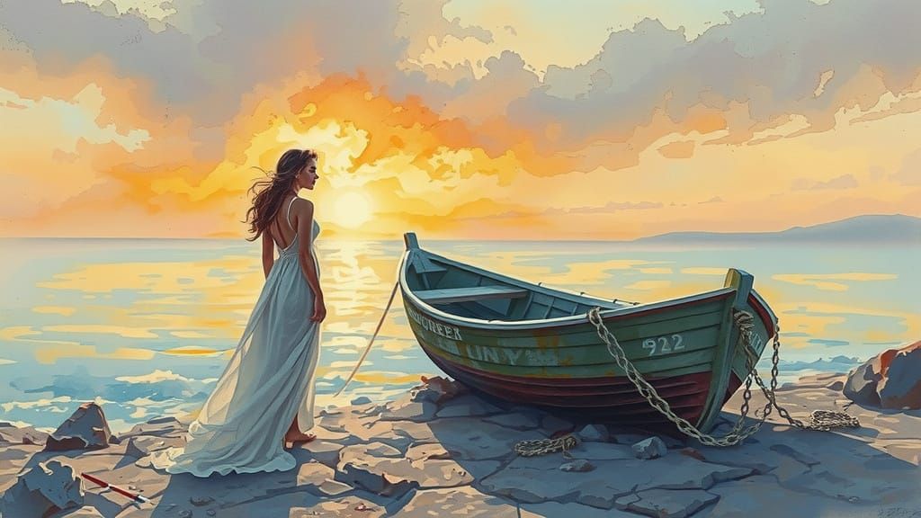 This image shows a beautiful woman near an old boat on a rocky shore at sunset. The watercolor painting features rough strokes and textures, with dramatic lighting.