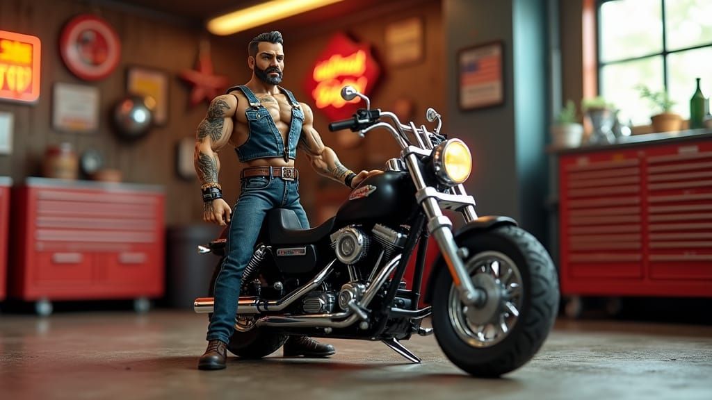 This image shows a nostalgic, hyper-realistic scene of a vintage American motorcycle garage, filled with retro details and a semi-chibi figure standing next to a meticulously crafted Harley-Davidson chopper, in a style reminiscent of classic illustrations and cinematic lighting.