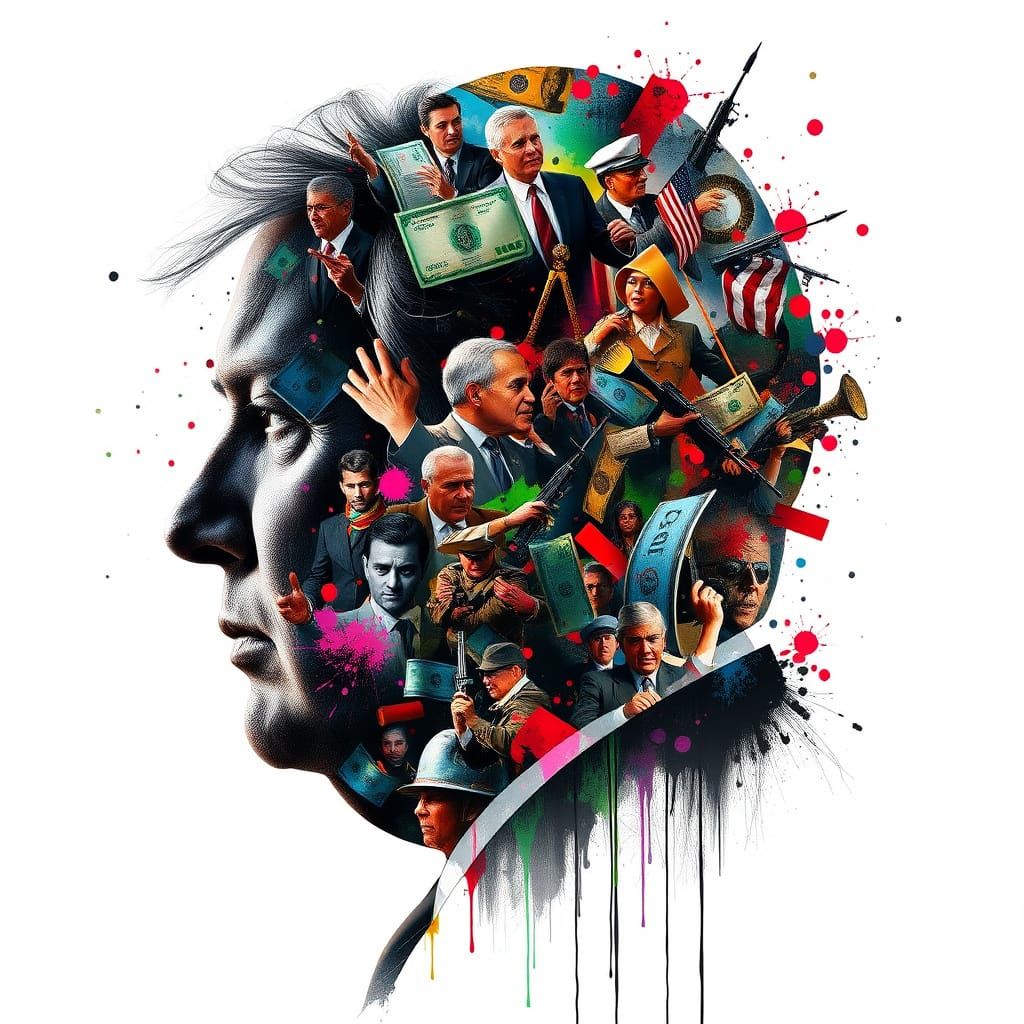 This image depicts a politician's profile amidst a chaotic backdrop of money, war, and corruption, created in a vibrant, double-exposure style reminiscent of street art and graffiti, with bold textures and high-contrast colors.