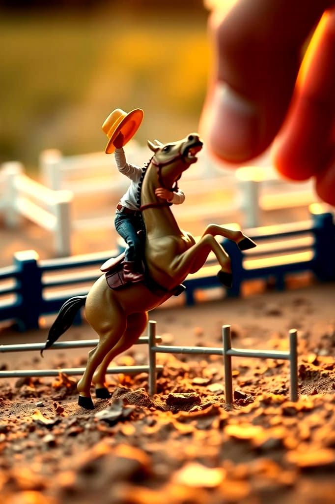 A photorealistic macro shot captures a vintage toy cowboy mid-air, bucked off his horse. Extreme shallow depth of field and golden hour lighting highlight the dynamic action.