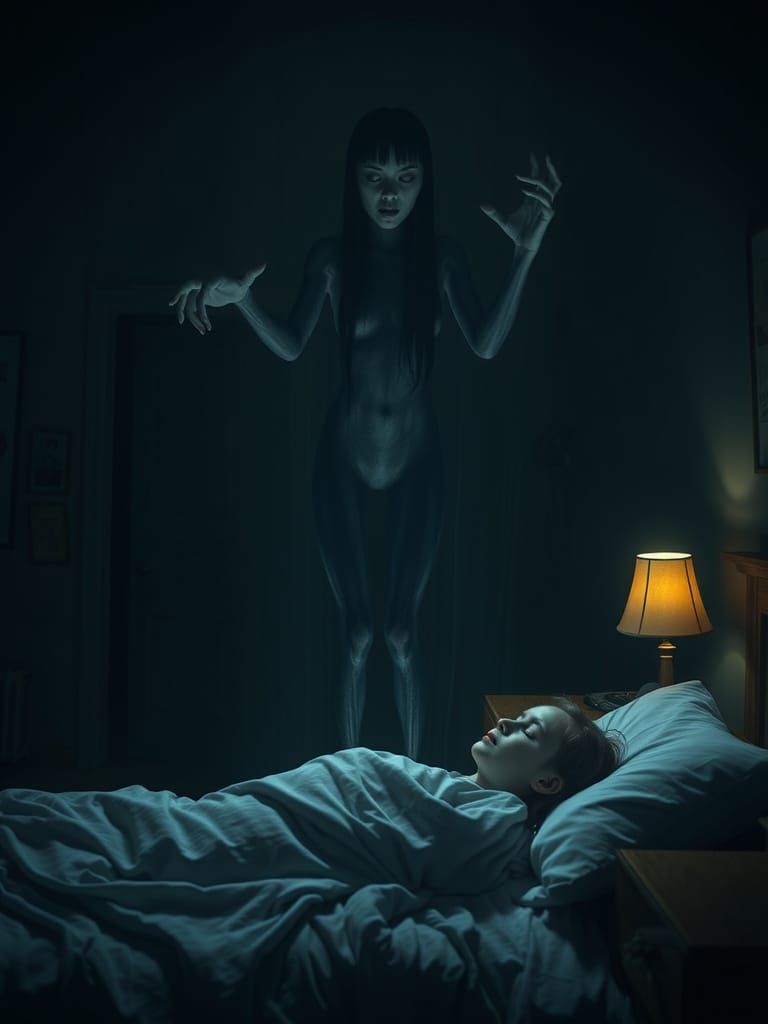 This image shows a spectral figure watching over a sleeping child in a darkened room. The scene is lit by a single lamp, with long shadows creating a tense, cinematic atmosphere in hyperrealistic digital art.