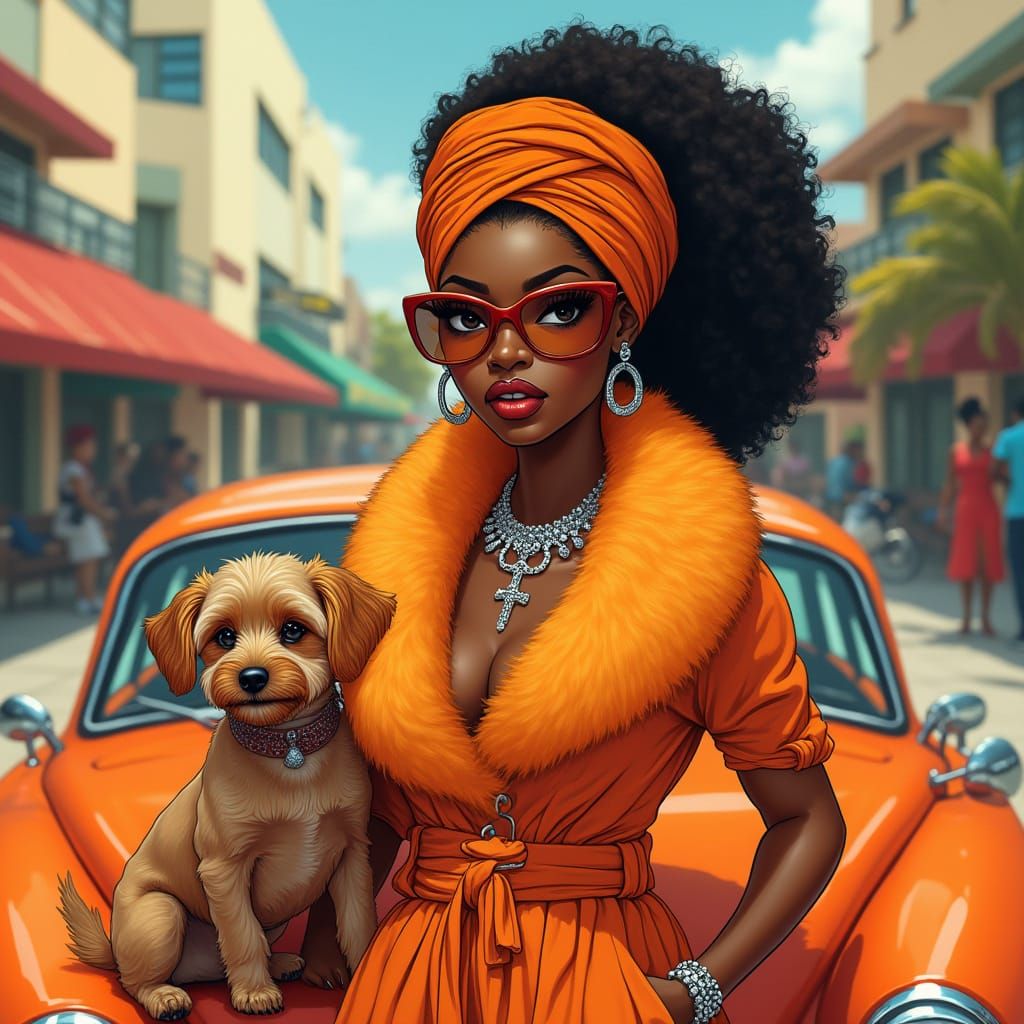 A striking picture of an African American woman in orange attire with a fur stole, silver jewelry, and head wrap, standing confidently beside a vintage car with her dog in a vibrant street scene. Rendered with exaggerated features in a Chibi-realistic style.