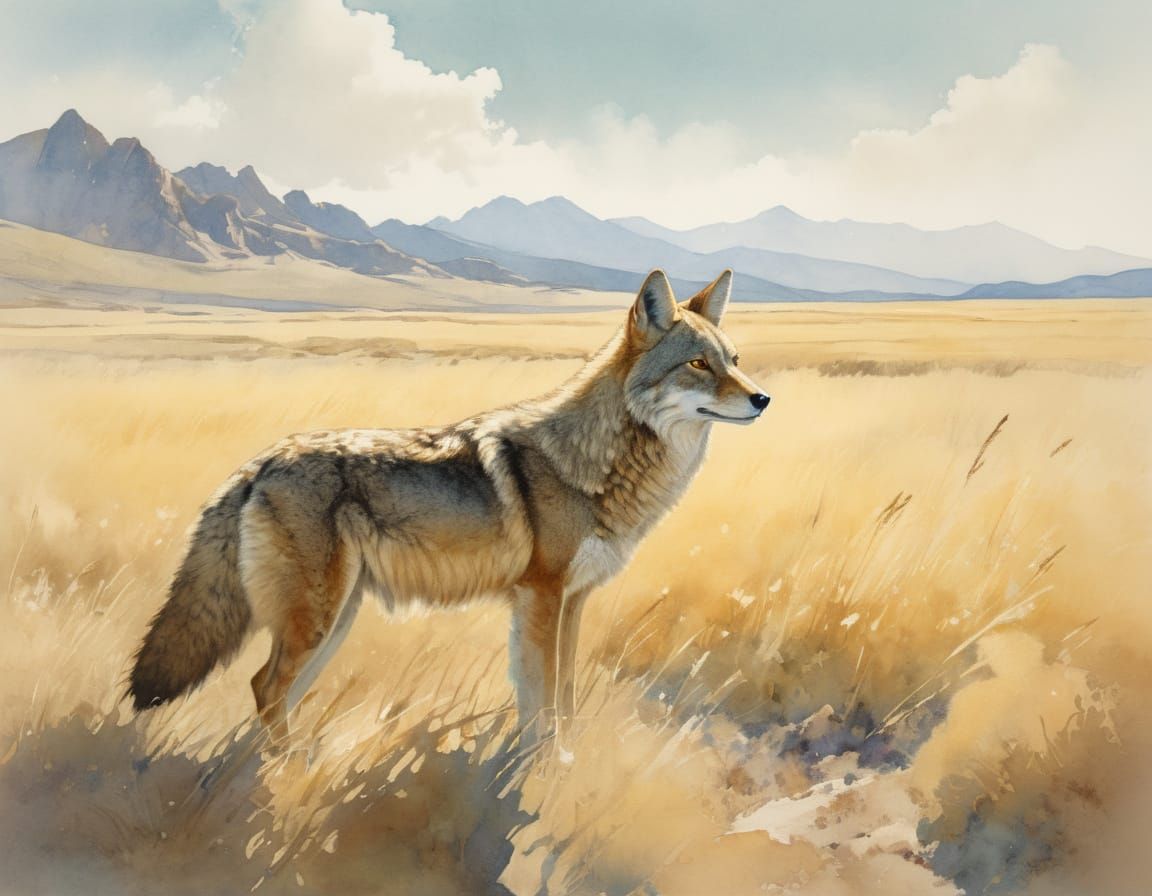 This image captures a lone coyote in a vast early summer prairie, rendered as a dreamy watercolour painting. It blends ethereal light with surreal textures and delicate linework, evoking themes of survival and freedom.