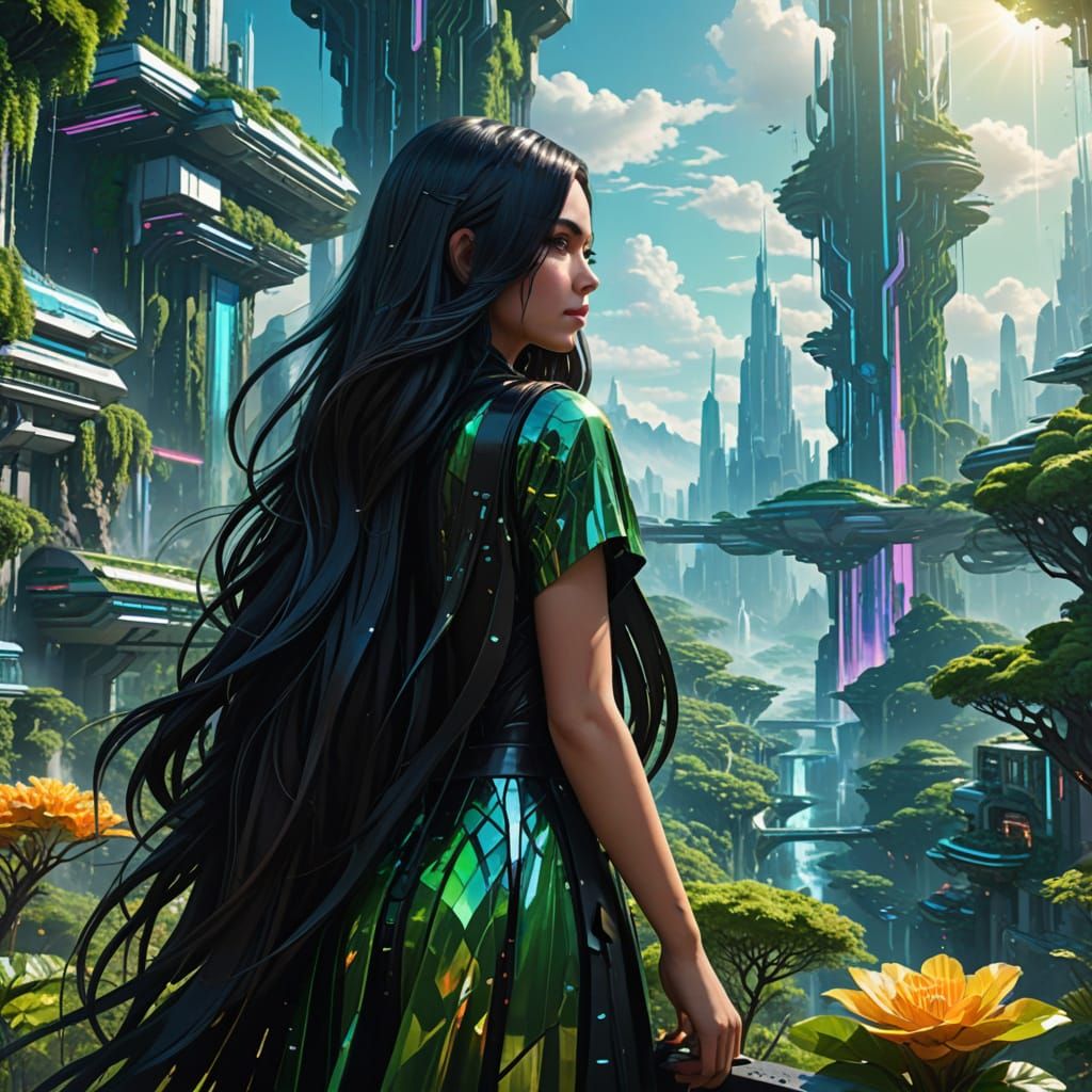 This image shows a brunette woman in a utopian world, her body enveloped in glossy black hair. Lush green scenery and a futuristic city form a breathtaking backdrop in this vibrant digital artwork.
