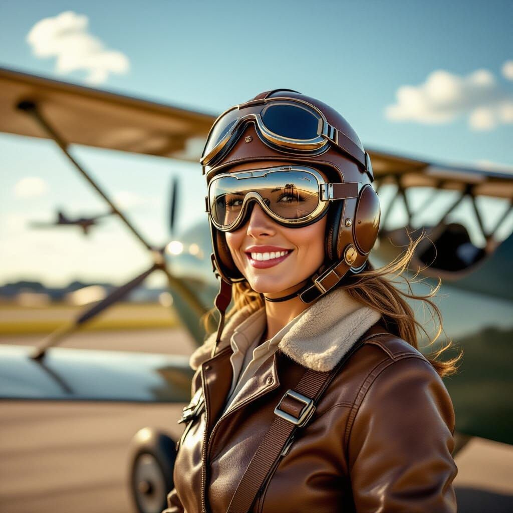 This image shows a female aviator posing before her biplane at a busy airfield. The photograph is sepia-toned with a soft focus and film grain, emulating 1930s photography.
