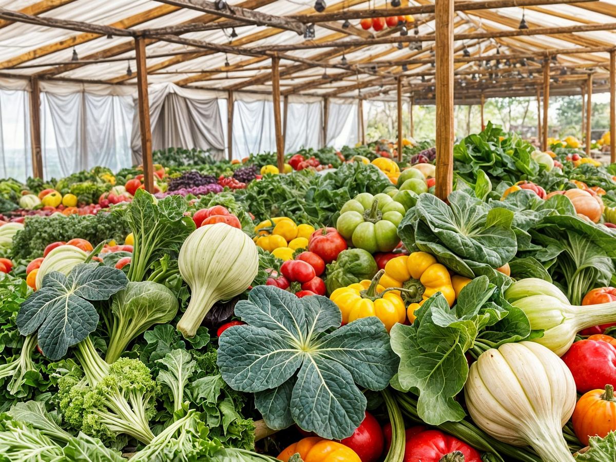 This image shows a vibrant assortment of vegetables grown on an organic farm. The scene emphasizes the freshness and colorful variety of the produce.