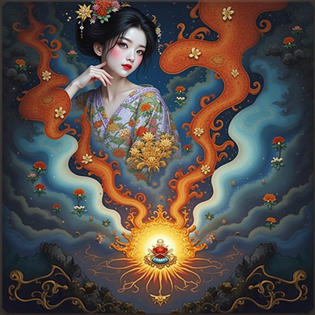 This image shows a hyperrealistic close-up portrait of a beautiful geisha with black hair and green eyes. She wears a colorful dress with golden motifs, set against a cosmic background, rendered with photorealistic detail.