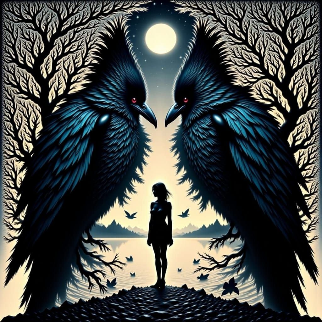 This image features a surreal double exposure effect with merged silhouettes, creating a mysterious and dreamlike atmosphere. It showcases intricate linework and deep shadows in a woodcut print style.