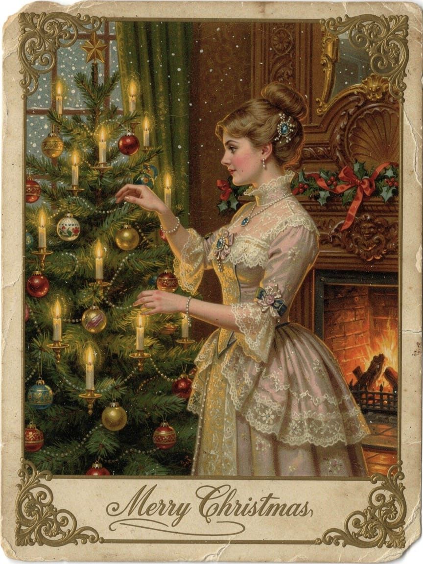 This vintage Christmas card features a woman decorating a tree in a parlor. The image evokes a classic Victorian holiday scene with a "Merry Christmas" greeting.
