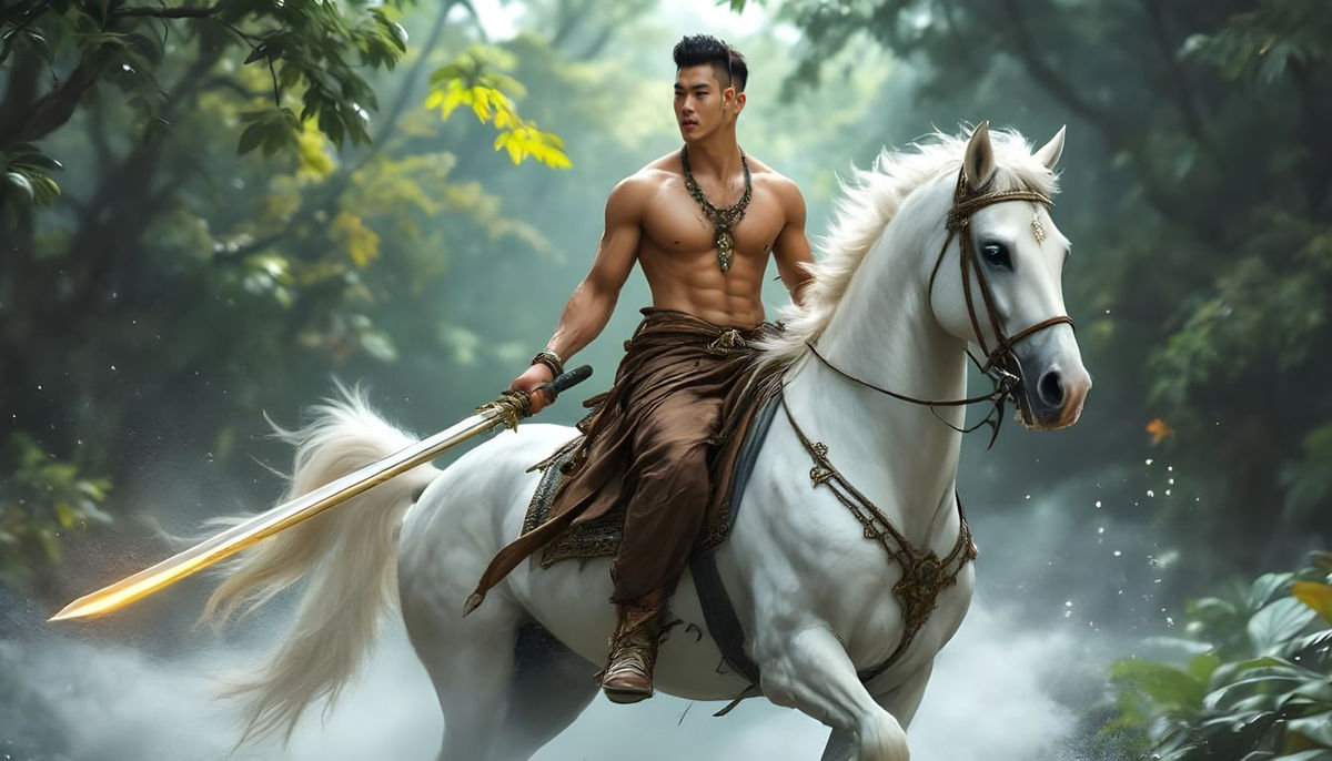 "4K A 24-year-old Thai man Super handsome with short hair. riding a white horse holding a long sword with a glowing sword, he was wearing brown antique cloth pants and antique shoes with Thai patterns. His muscles are beautiful, wearing only a necklace with Thai patterns. The backdrop is the tropical forests of Thailand."