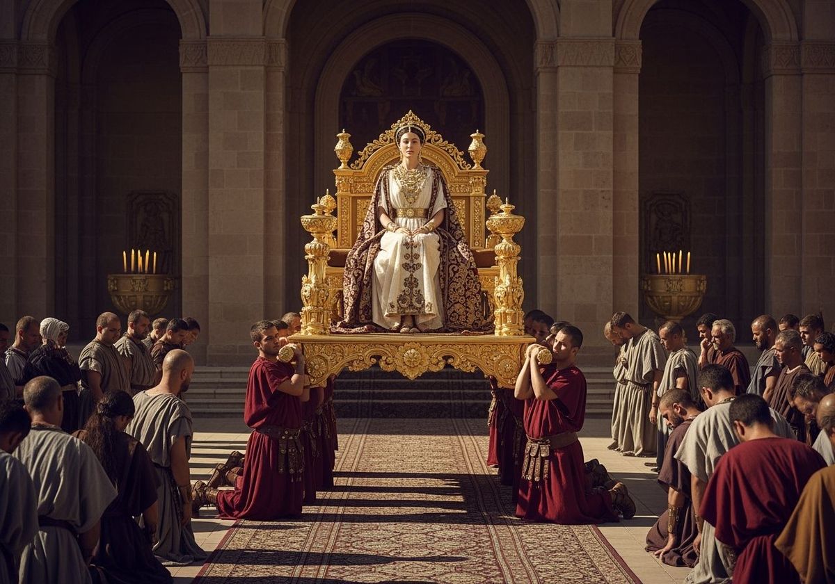 This image shows a Roman Empress on a golden litter carried by servants as citizens kneel before her. The photo uses natural lighting and shallow depth of field.