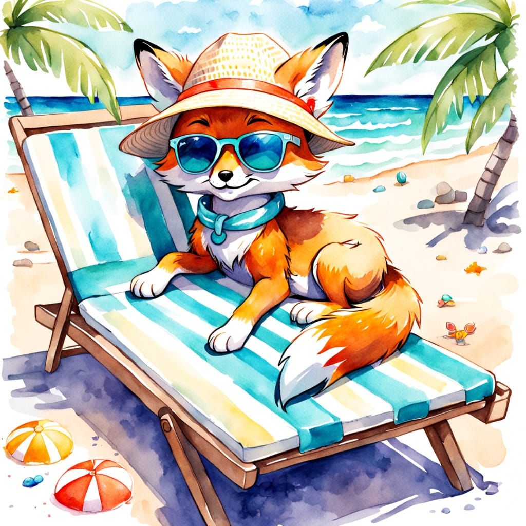 This image shows a charming watercolor sketch of a playful fox cub relaxing on a sun lounger, complete with sunglasses, swim shorts, and a hat. It captures delightful summer vibes with soft, vibrant colors and whimsical brushstrokes.