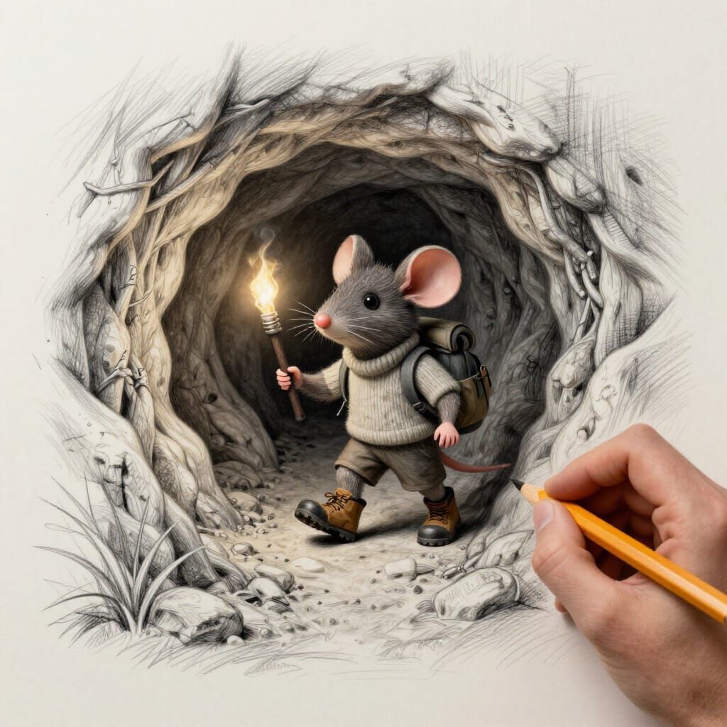 This image shows a cute, anthropomorphic mouse hiker with a knapsack and torch stepping out of a cave. It combines 2D line art with realistic 3D rendering, creating a tactile, graphic illustration.