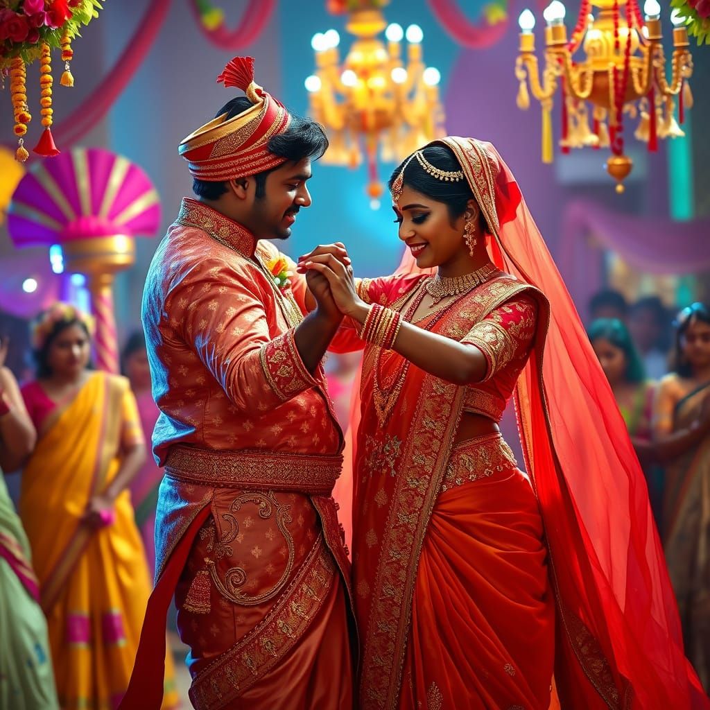 This image captures the joyous moment of an Indian wedding, with the bride and groom dancing in harmony, surrounded by elaborate decorations and colorful costumes, infused with the emotional depth of digital art.