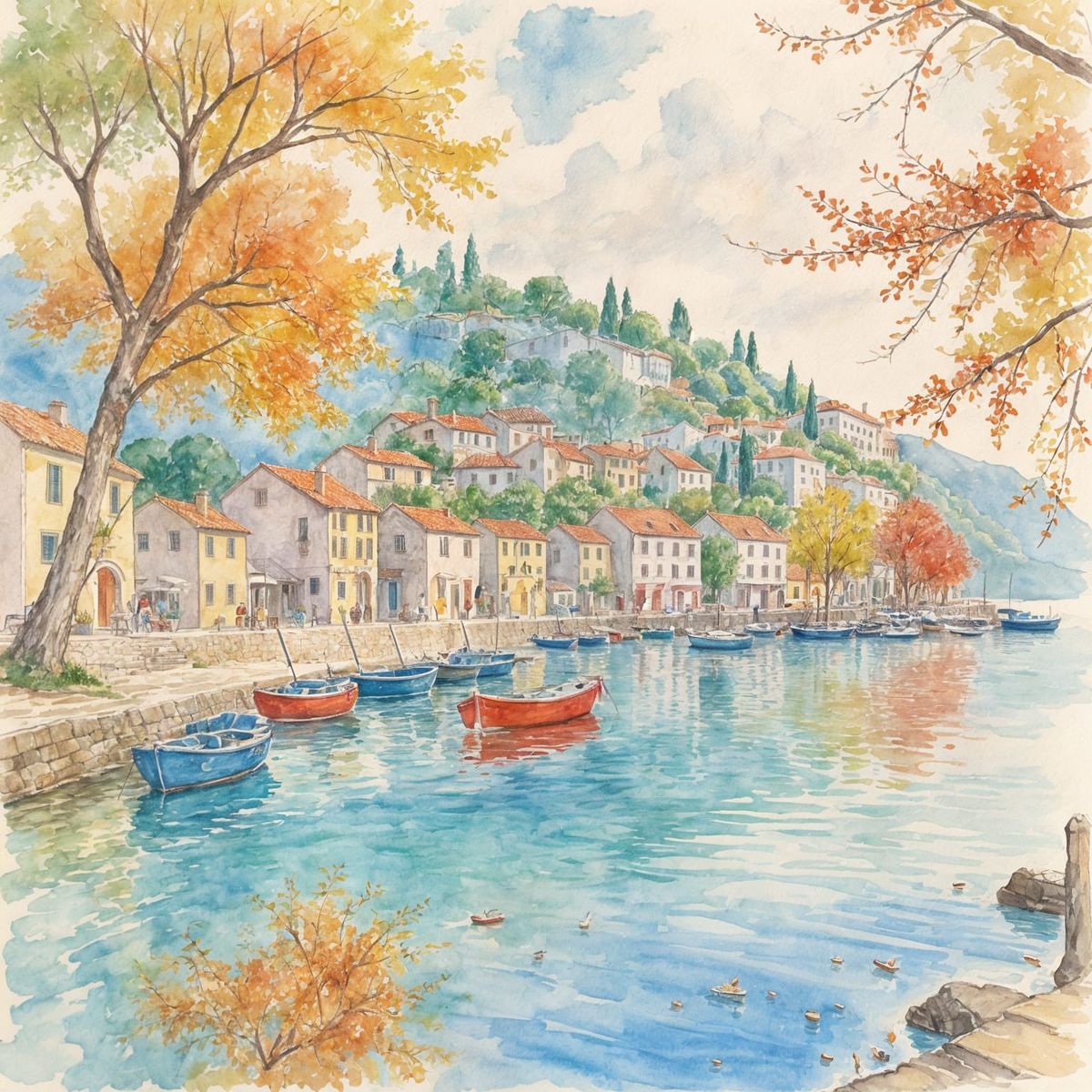 A serene view of a Croatian village harbor in autumn. Small fishing boats are docked at the pier, with their reflections visible in the tranquil water, in pastel watercolor style.