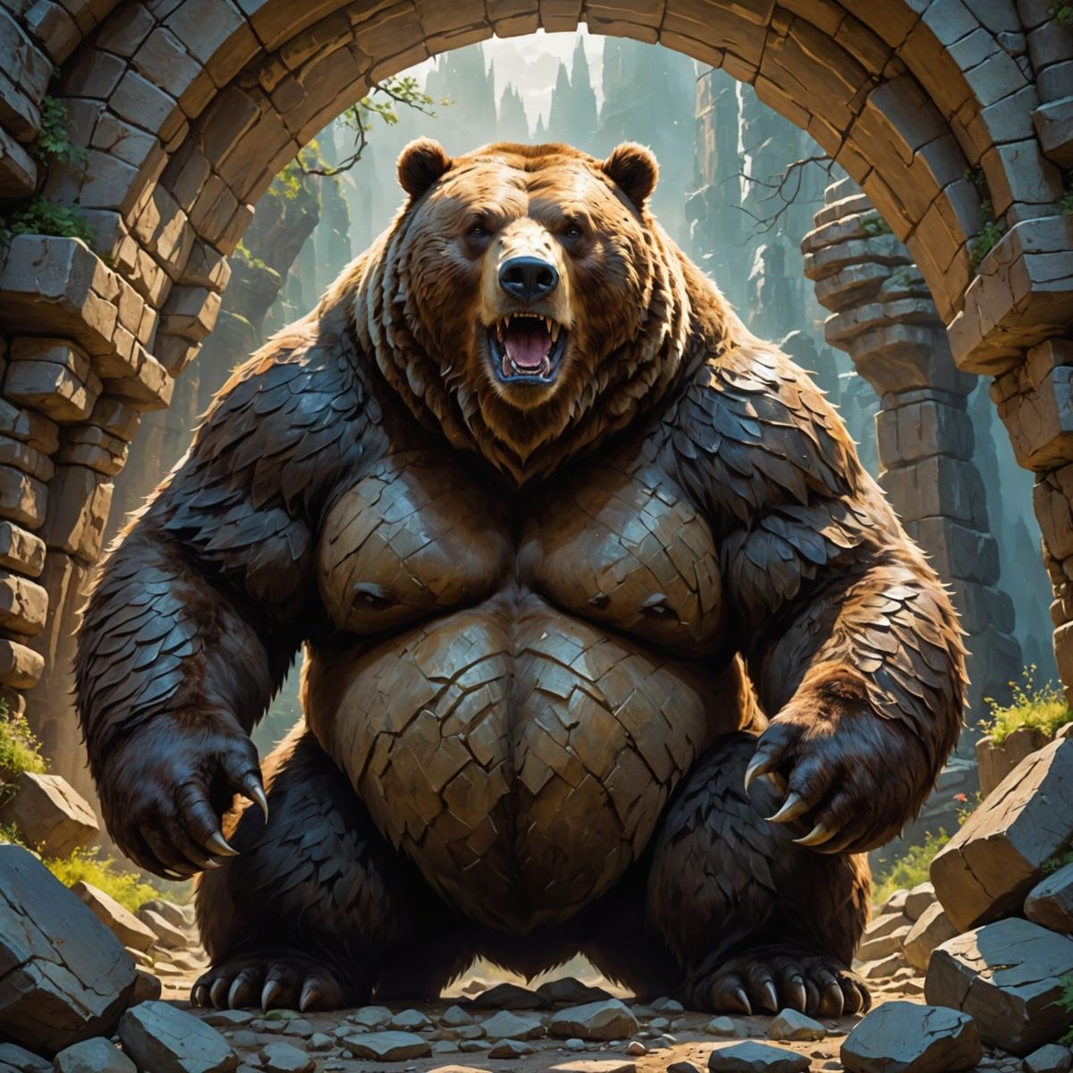 This image shows a magical grizzly bear geomancer with a body of rock. The bear has a concerned expression, set against a softly lit cavern backdrop in a dungeons and dragons artistic style.