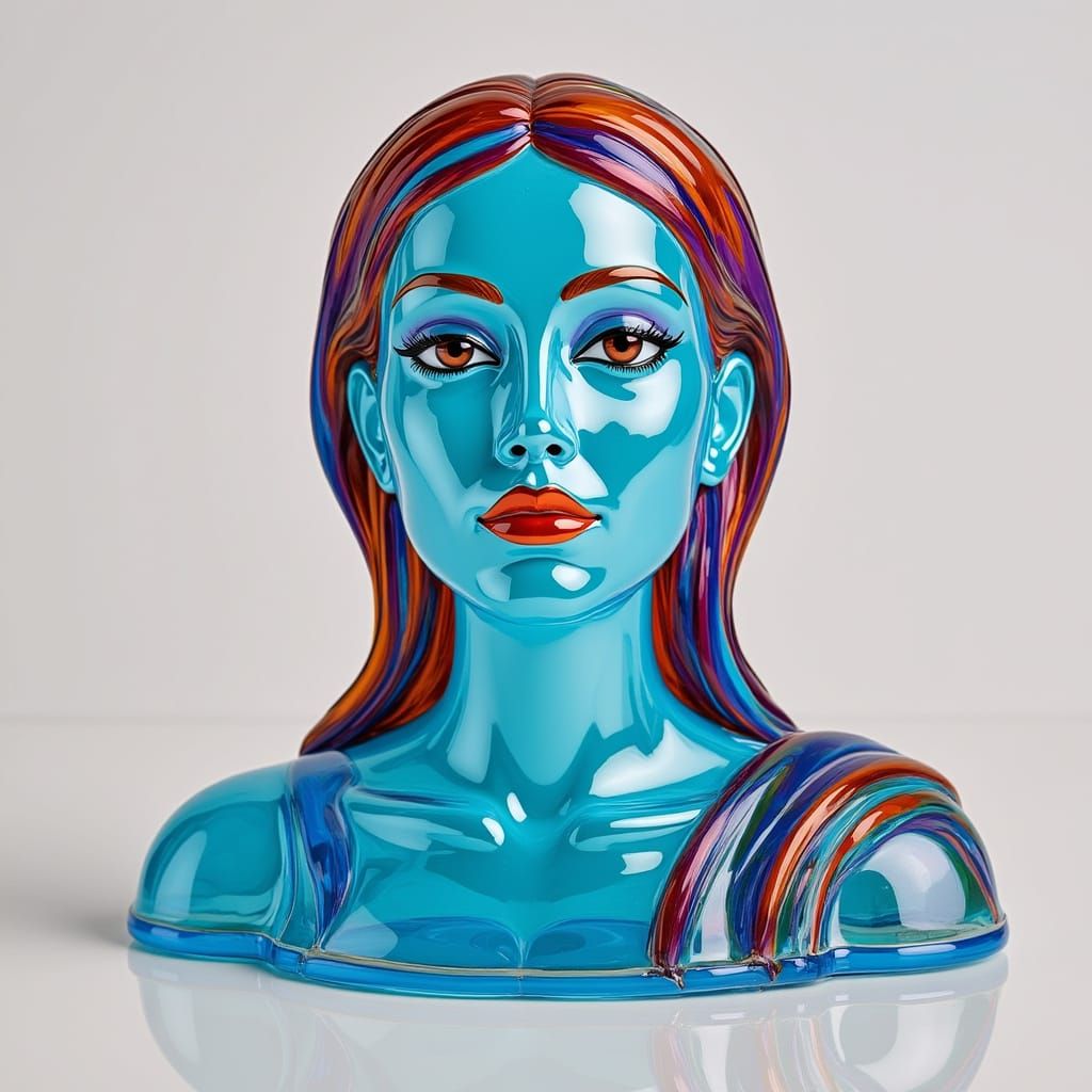This image shows a beautiful young woman as a glass sculpture. The sculpture is rendered in vibrant, iridescent colors and with intricate detail.