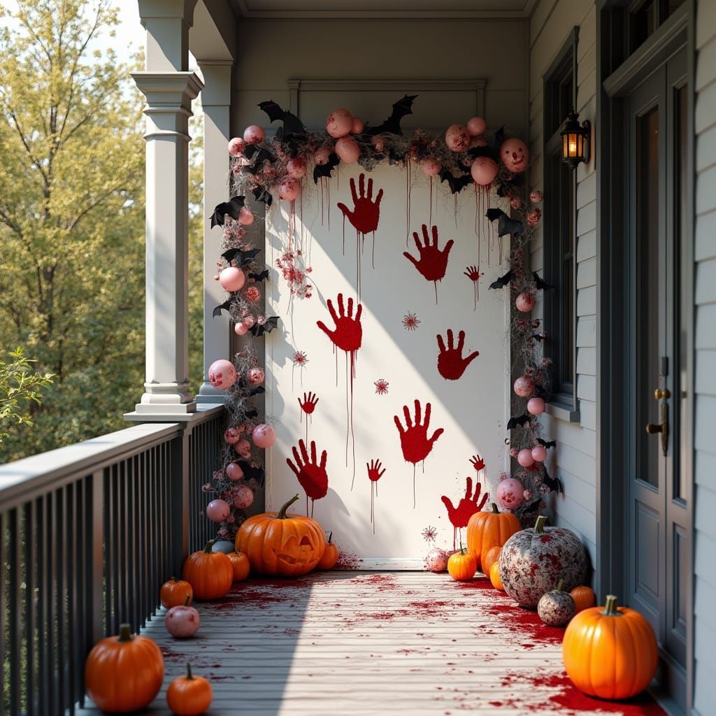 A daytime outdoor Halloween scene on a decorated balcony. The scene includes a photo booth backdrop, balloons with handprints, paper bats, spider webs, and jack-o'-lanterns in a photorealistic style.