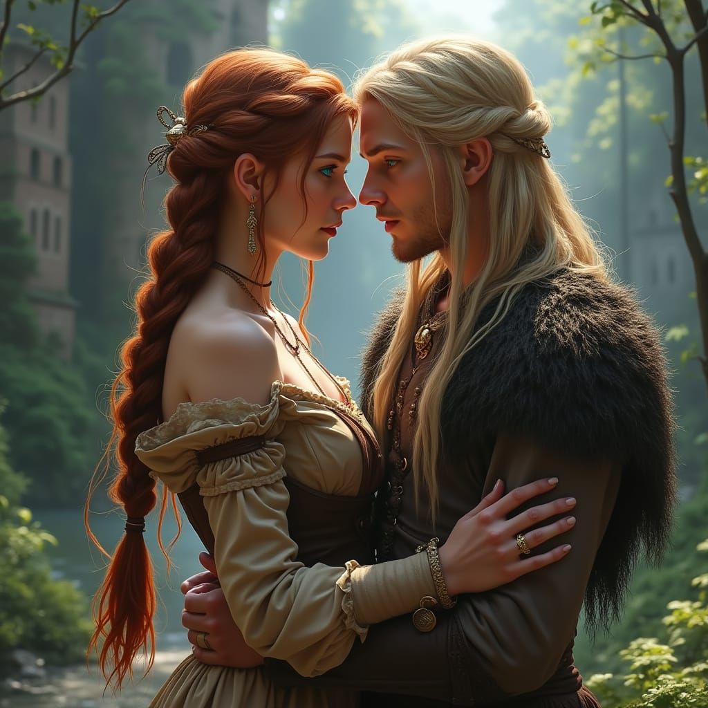 This image shows a romantic scene of a young woman with auburn hair and a man with blonde hair in a medieval castle setting. Rendered as detailed fantasy concept art.