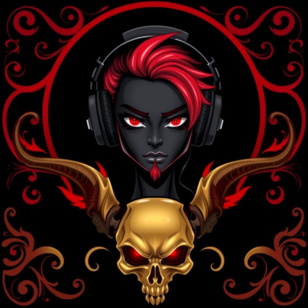 This image shows a stylized figure in a dark, intense atmosphere. The figure has black skin, striking red hair, and wears large black headphones. A golden skull with fiery red eyes is in the background, surrounded by intricate designs and swirling accents.