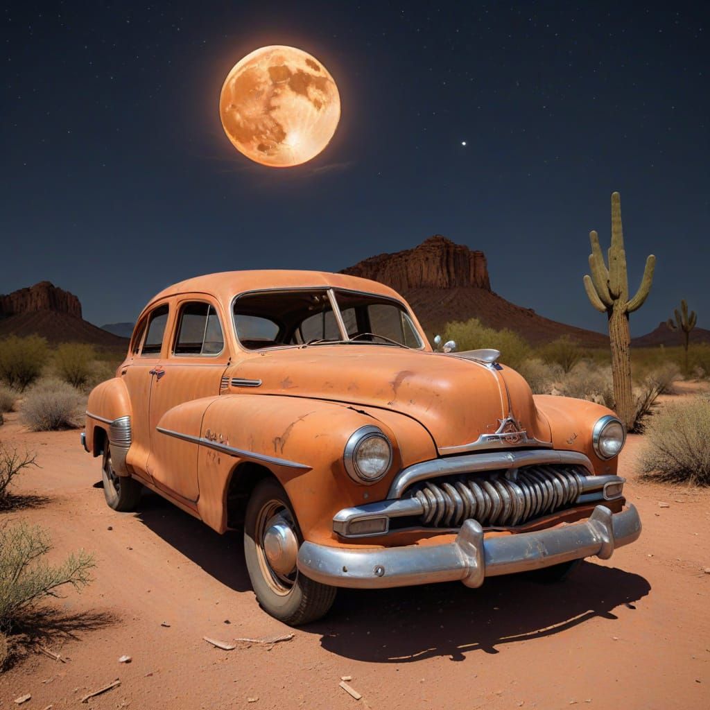 This image depicts a derelict vintage car situated in a spooky Arizona desert landscape illuminated by a large, round orange moon.
