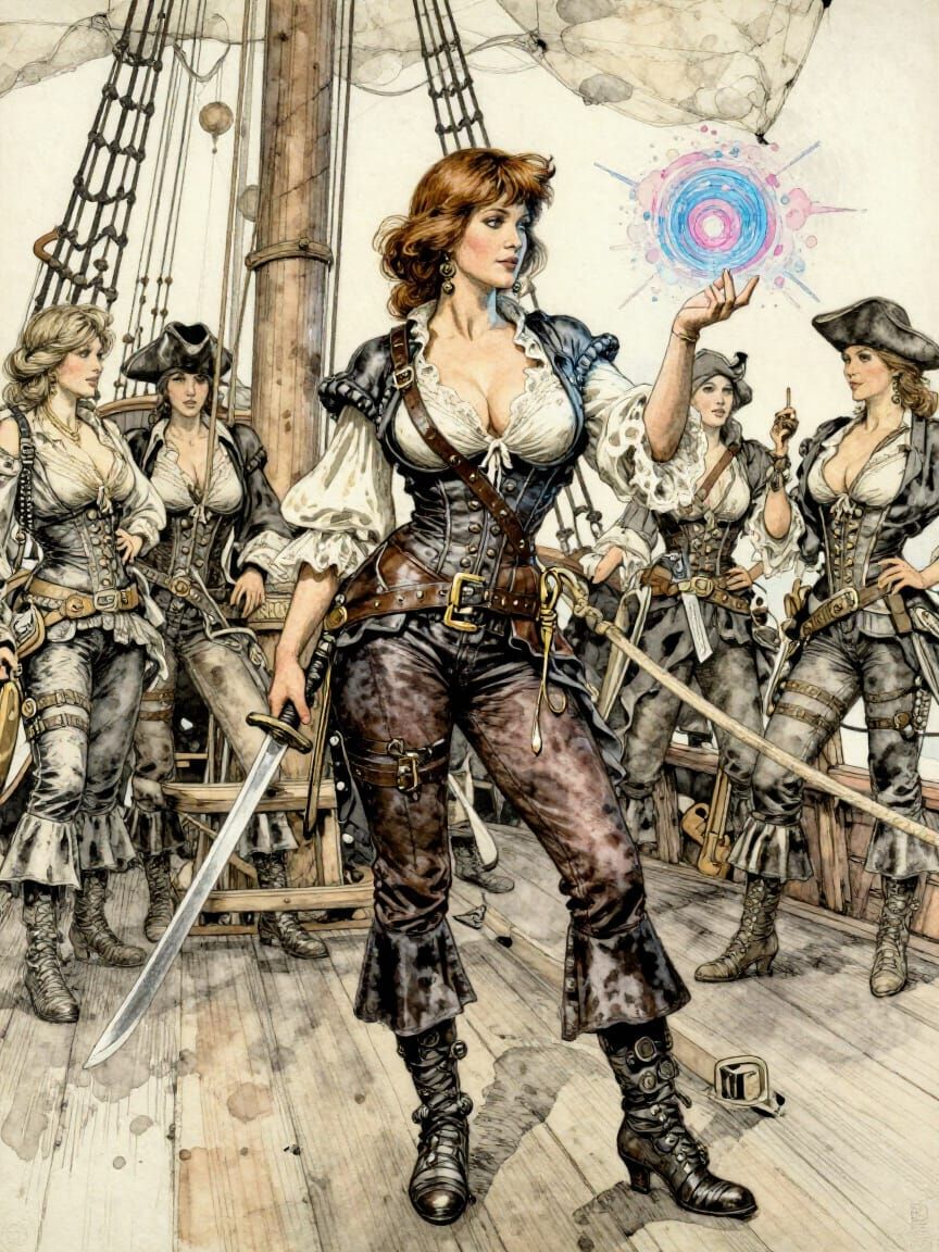 full body shot with shoes, a beautiful mature woman, huge bosom, brunette bob cut hair, Dressed as a pirate in leather and lace, Standing on the deck of a pirate ship, Holding a cutlass in one hand at her side while the other is conjuring a spell of a small blue and pink portal, behind her is a group ...