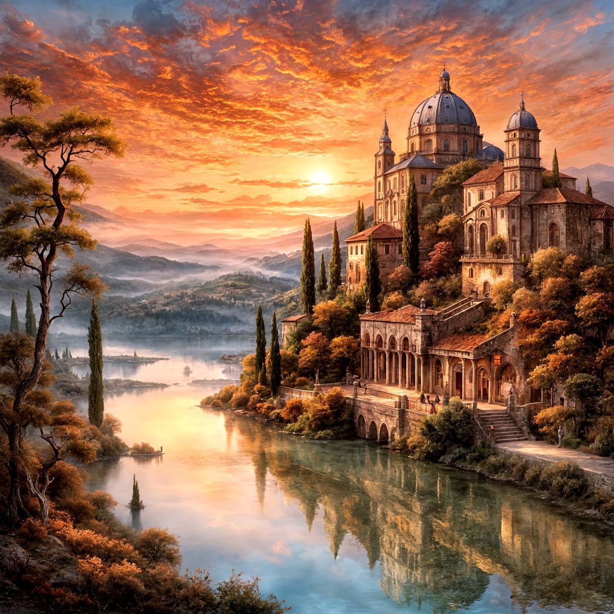 A picturesque view of a Tuscan town reflected in a tranquil lake during sunset. The art evokes the style of Luis Royo, featuring detailed clouds and a magical, cinematic atmosphere.