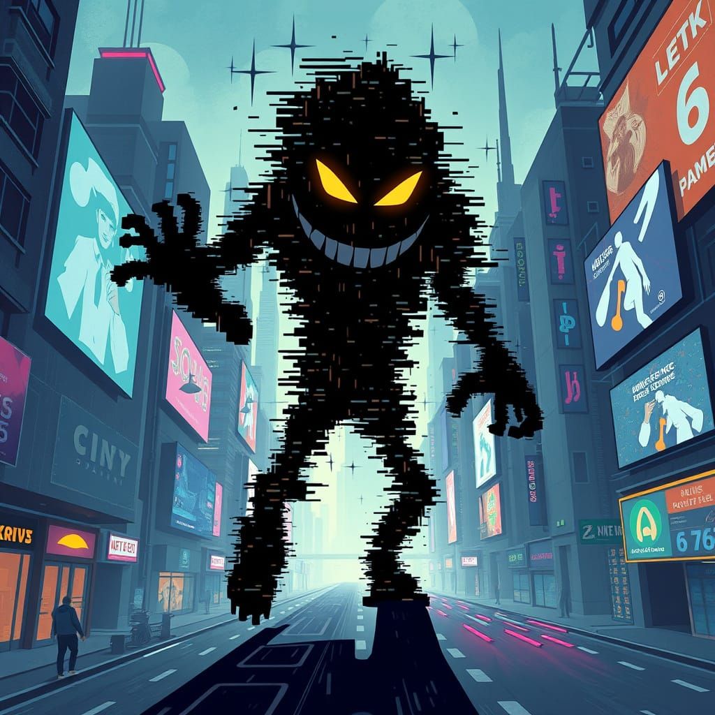 A digital supervillain made of distorted pixels causes chaos in a futuristic city. Buildings flicker and holographic advertisements shatter in this image with vibrant colors.