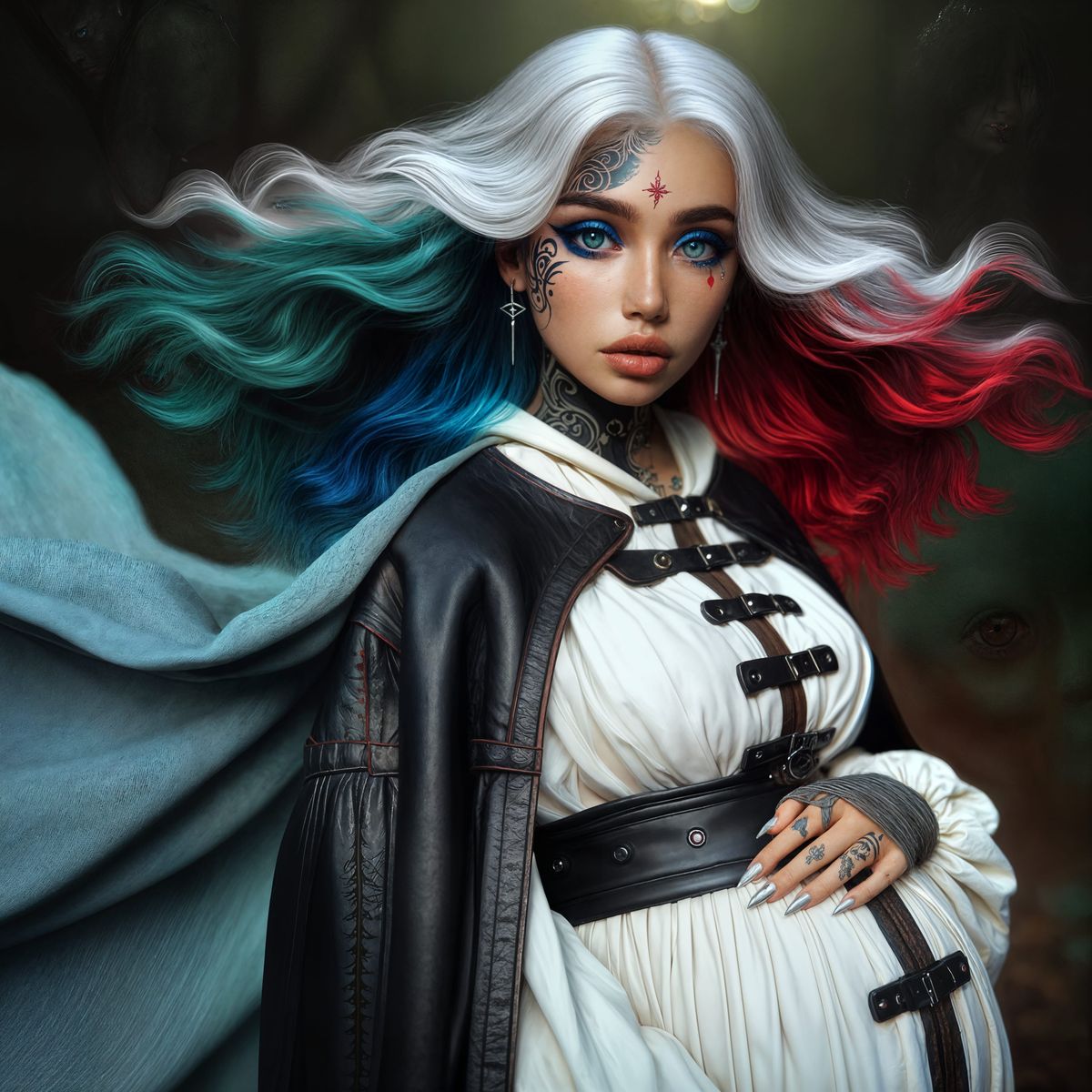 A pregnant woman with white, blood red and blue hair, green eyes, fair skin with face tattoos, blue eye shadow, black eyeliner and red lipstick, wearing a white dress, black leather armor and aqua cloak, standing in a forest.