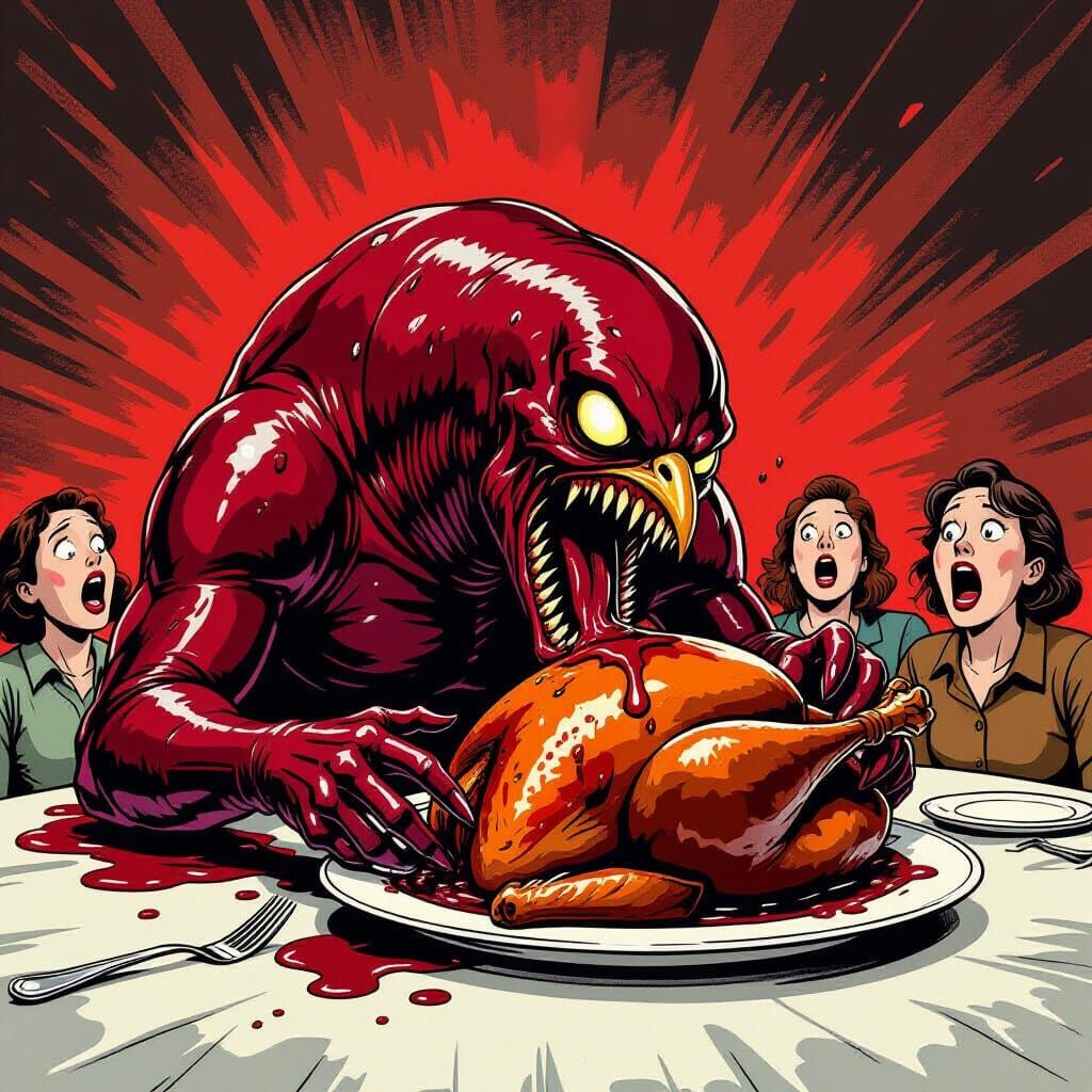 A grotesque, translucent cranberry sauce monster consumes a Thanksgiving turkey as terrified onlookers scream. Rendered with dramatic lighting and a dark, rich color palette.